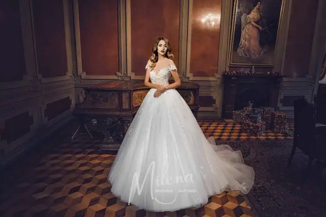 Φουσκωτό νυφικό με ρασμίρ και δαντέλα