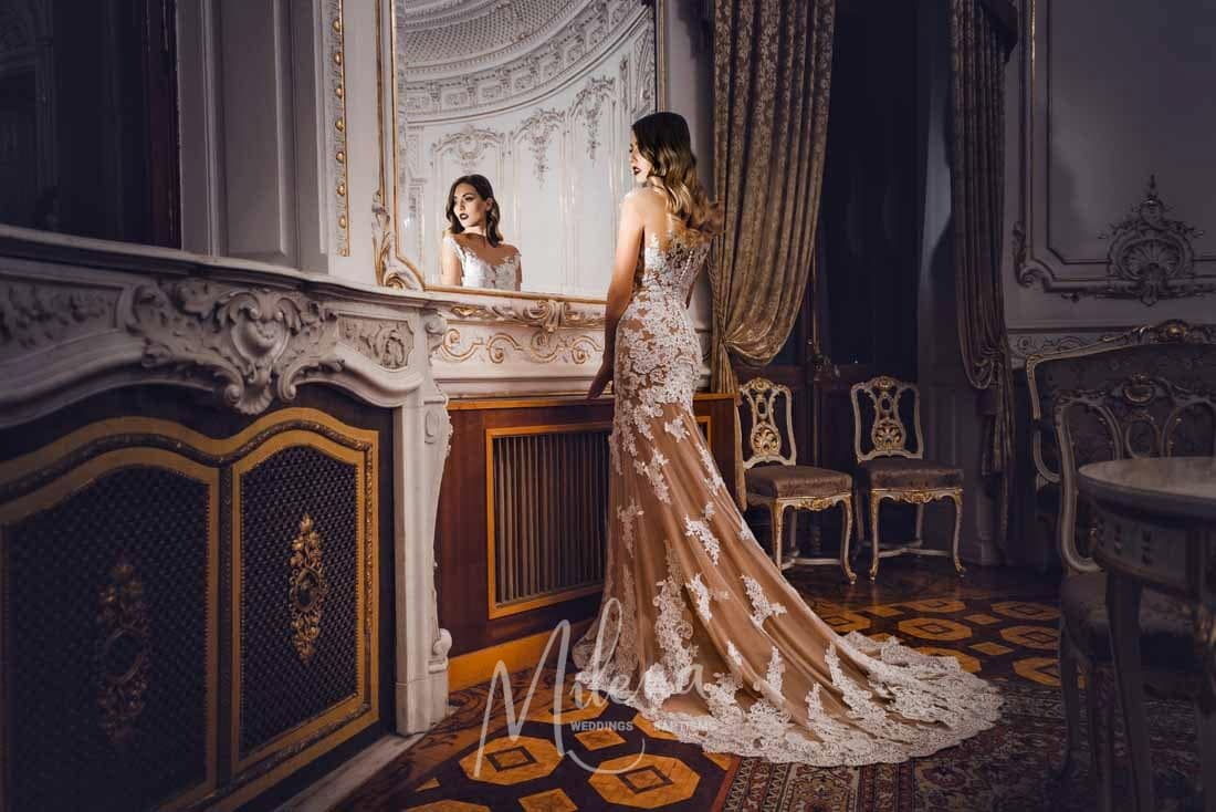 Γοργονέ νυφικό με nude τούλι και ουρά