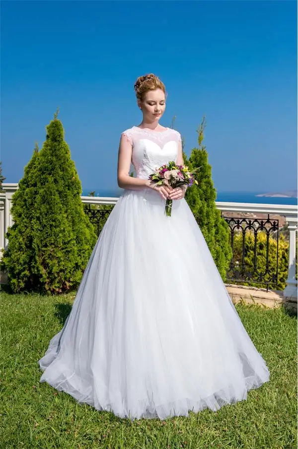 Νυφικό Α-γραμμής με δαντέλα και μεγάλη ουρά