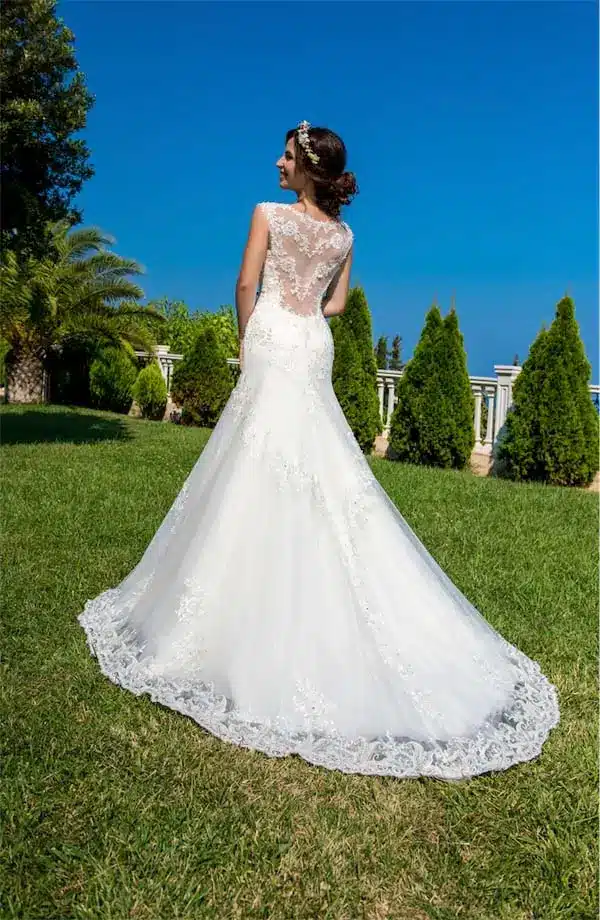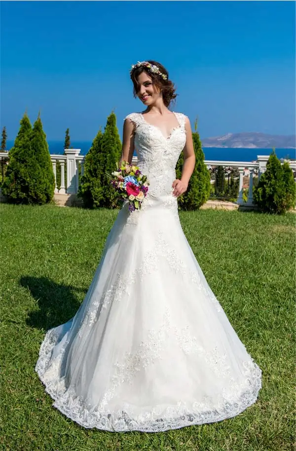 Στενό ίσιο νυφικό με δαντέλα και ουρά