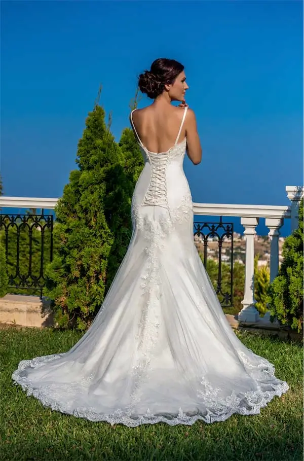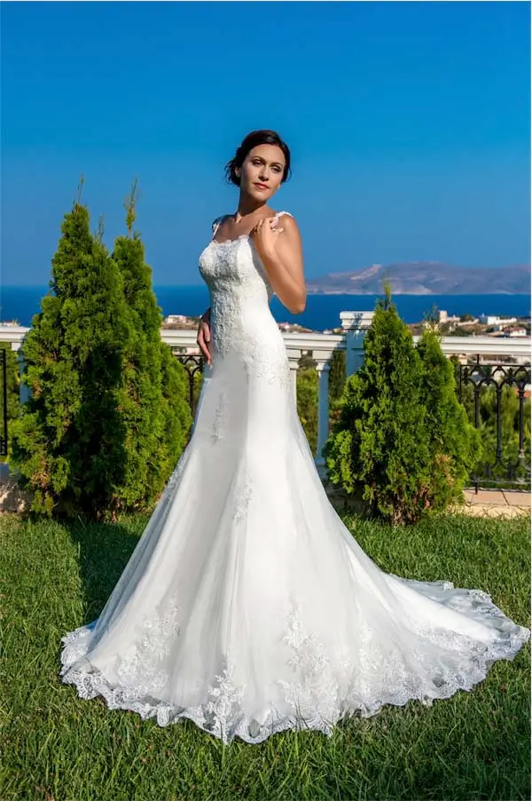 Νυφικό Α-γραμμής με δαντέλα και μεγάλη ουρά