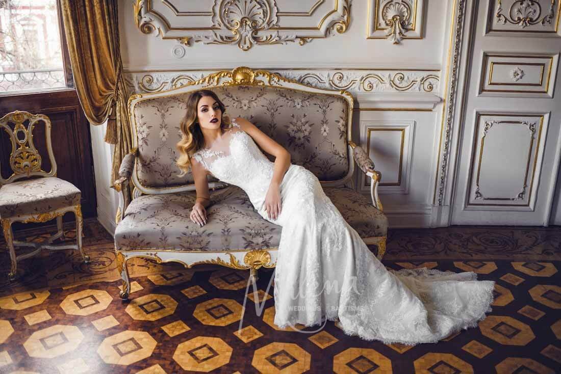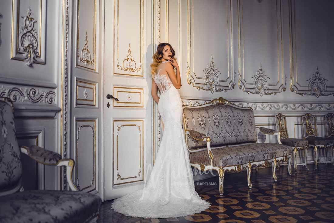 Στενό νυφικό τύπου γοργονέ με δαντελένιο μπούστο με διαφάνεια, φούστα με δαντέλα και τρέσα στο τελείωμα.